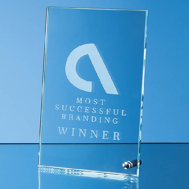 The stylish and versatile jade glass rectangle can be displayed vertically or horizontally with the aid of a chrome pin stand. There is a large area that can be printed or engraved with any crest, logo or wording to create an inexpensive recognition award or gift. The rectangle is available in 4 other sizes.