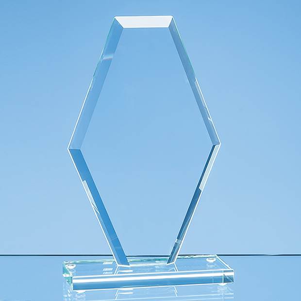 The stylish facet clipped diamond award is crafted out of 1cm thick jade glass and is mounted on a rectangular base. It is an elegant design that can be personalised with any logo, crest or wording and presented as an achievement award or gift. The award is also available in 20cm and 22cm.