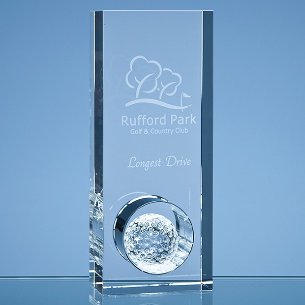The Hole award has a circle cut and polished all of the way through the optical crystal rectangle, a 4cm optic golf ball is then mounted in the hole. There is a large engraving area on the top part of the rectangle that can be personalised with any club crest, logo or wording to create a gift that is sure to take pride of place when put on display. It is supplied in a black foam lined presentation box.