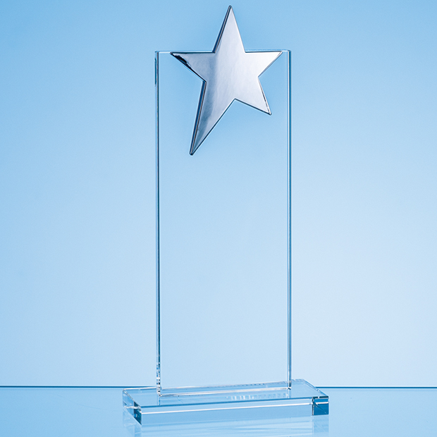 The 21.5cm Optical Crystal Mounted Rectangle with Silver Star is the embodiment of recognition and achievement, meticulously crafted to celebrate excellence with a touch of stardom. The award stands as a symbol of distinction, seamlessly merging optical crystal with a shining silver star to create a stunning masterpiece. With a commanding height the Mounted Rectangle draws attention with its graceful form and captivating design. It can be personalised with any crest, logo or wording to create an award that is sure to be treasured by the recipient. The award is supplied in a foam lined gift box.