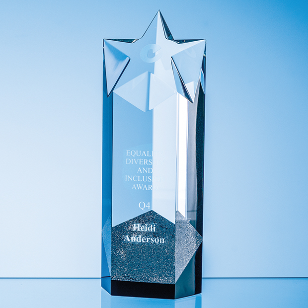 The 24cm Sparkling Silver Optical Crystal Star Column Award is an exquisite embodiment of distinction and achievement, thoughtfully crafted to honour excellence with an undeniable touch of glamour. The award features a sparkling silver layer that is encapsulated between the onyx black base and optical crystal star column. The award can be engraved on the top of the star and also on the front face of the column. It is supplied in a foam lined gift box.