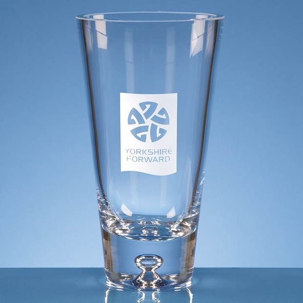 The handmade tapered vase has a bubble base and is a conical shape. It would make a great gift to display at home or in the office. There is a large engraving area that can be personalised with any crest, logo or wording to make something truly unique.