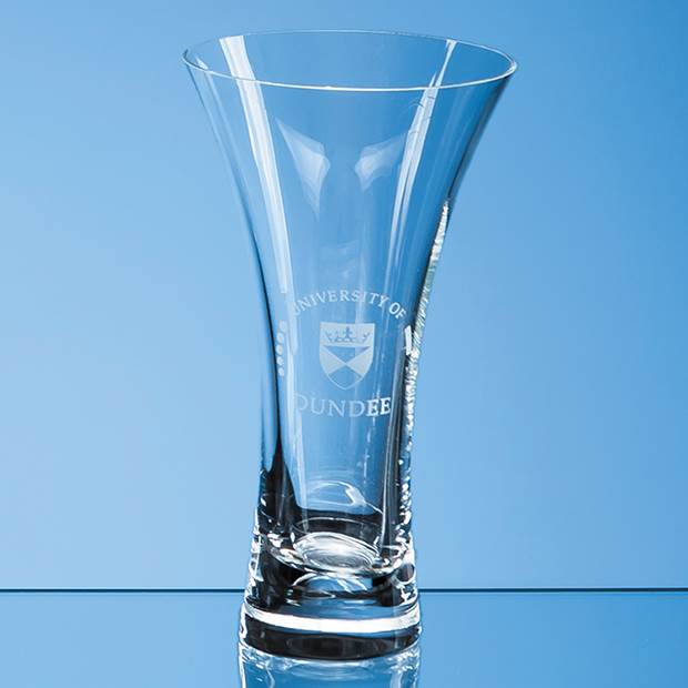 Contemporary and elegant with clean lines and a simple tulip shape this 18cm Neptune crystalite presentation vase is the ideal gift for so many occasions personal or business. There is an engraving area above the base to add a message, greeting, logo or crest. Alternatively you could choose a slightly larger 21.5cm SL523 or 25cm size vase SL524 should the occasion or budget allow. The vase is supplied in a blue gift box.