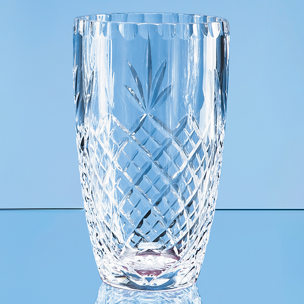 Perfect to display a beautiful bouquet of flowers and to double up as a corporate recognition award sports trophy or memento of a special event or occasion whether a birthday retirement anniversary. This 19cm lead crystal panelled oval vase is embellished with a classic diamond and wedge cut design and incorporates a space to engrave a special message logo or crest. Available as an option is a beautiful presentation box with blue satin lining.