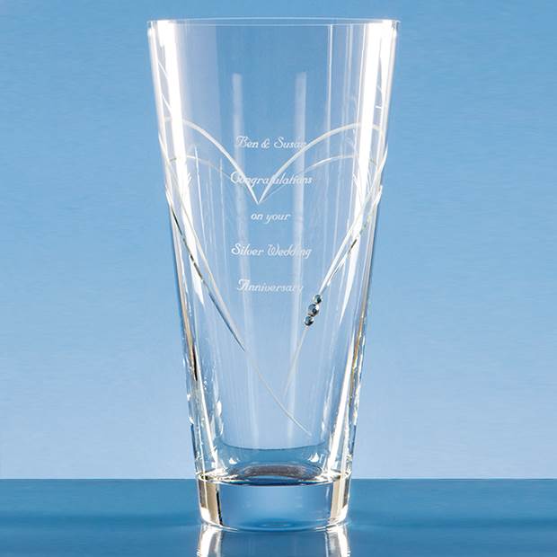 This conical vase has heart shaped detail with 3 Swarovski crystals bonded to the side of the vase. There is an engraving area that can be personalised with any logo, crest or wording making it the perfect keepsake gift for a wedding or anniversary. The vase is also available in 20cm and 30cm and is supplied in an attractive Gift Box.