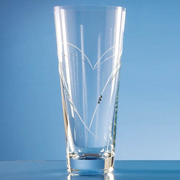 This conical vase has heart shaped detail with 3 Swarovski crystals bonded to the side of the vase. There is an engraving area that can be personalised with any logo, crest or wording making it the perfect keepsake gift for a wedding or anniversary. The vase is also available in 20cm and 25cm and is supplied in an attractive Gift Box.