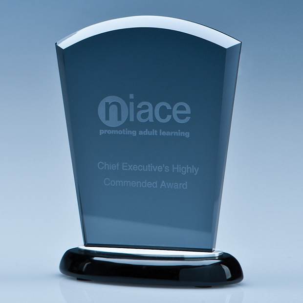 This ultra stylish 13.5cm Arch award perfectly combines 3 different materials of smoked glass that is bonded into a brushed aluminium section and mounted onto the black piano finish wood base. The glass arch has a large engraving area that can be personalised with any crest, logo or wording to create an award that is sure to take pride of place when put on display at home or at work.