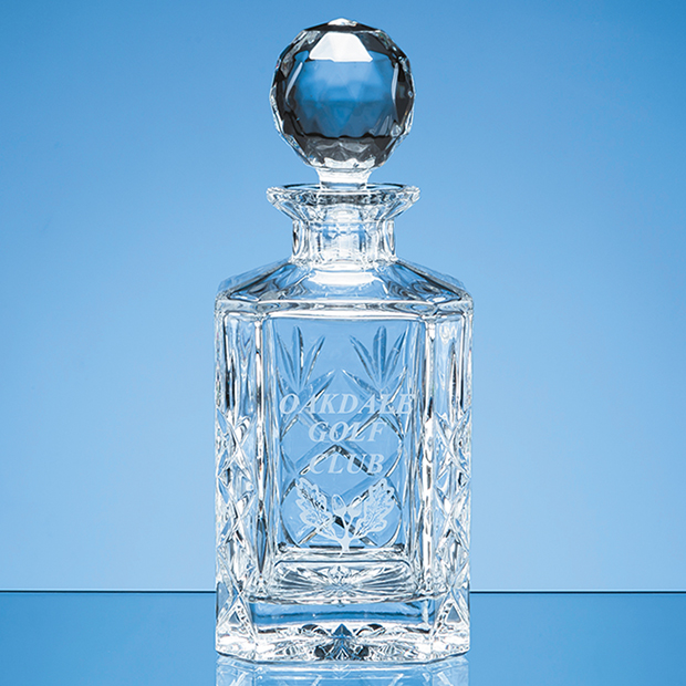 The elegant square spirit decanter is beautifully crafted out of 24% lead crystal and has a traditional diamond cut pattern hand cut and polished on 3 sides leaving 1 side plain for engraving. The plain side has the benefit of a large engraving area that can be personalised with any crest, logo or wording to create a gift that is sure to take pride of place when put on display at home or at work.