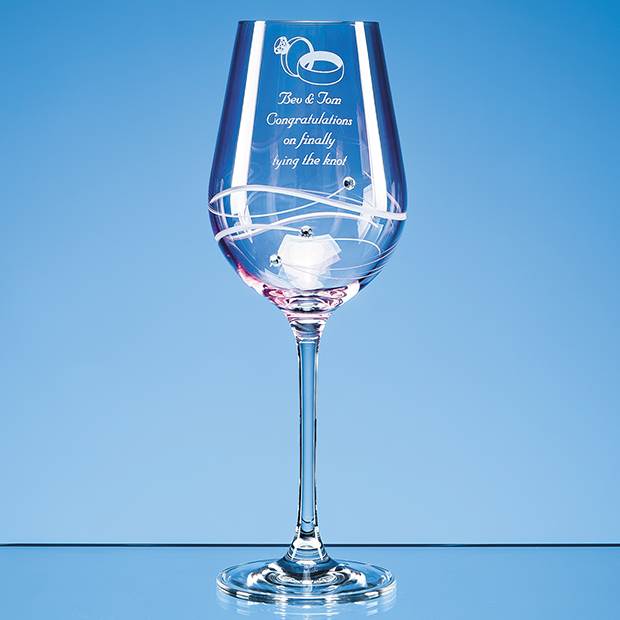 A single elegant long stemmed pink tinted wine glass would make the perfect romantic gift or memento of an engagement wedding birthday or anniversary. A delicate spiral cut design and three sparkling Swarovski Diamante crystals placed along the swirl add a touch of glamour. And it can be personalised with an engraving of a date names inscription or message. To make it extra special why not order with a beautiful presentation box lined with satin
